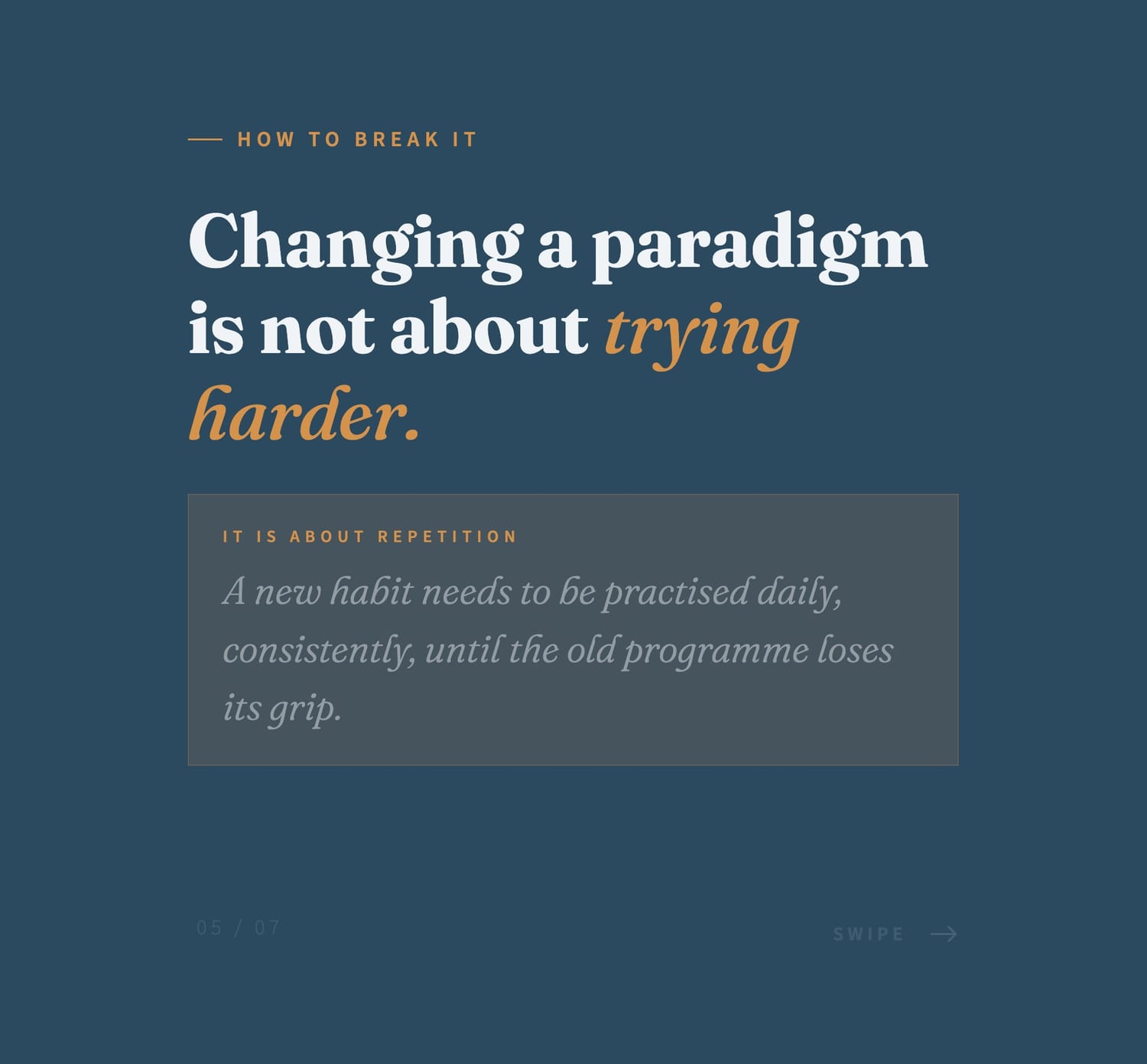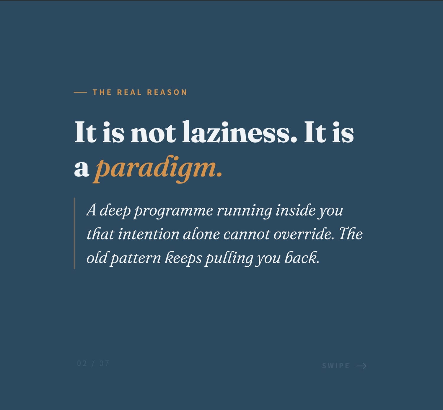 But because there is a programme running inside us — a habit so deeply worn — that it takes more than intention to shift it.